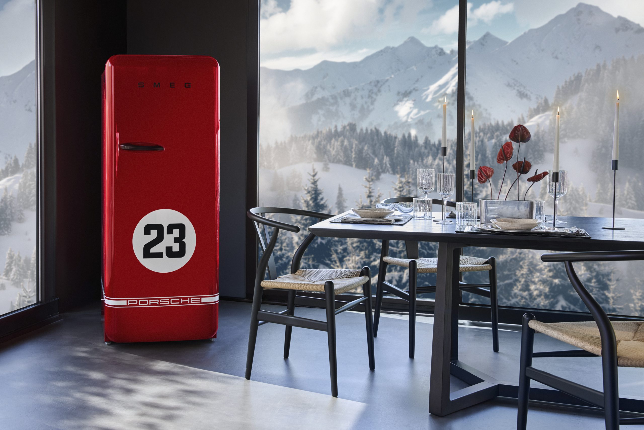Kühlschrank 917 Salzburg – Porsche x Smeg Der Kühlschrank 917 Salzburg – Porsche x Smeg ist das exklusivste Modell der Porsche x Smeg Kühlschrankreihe. Es sind nur 1.970 nummerierte Exemplare erhältlich, die jeweils durch eine Metallplakette als Unikate gekennzeichnet sind. Die Limited Edition würdigt den historischen Sieg des Porsche 917 KH Salzburg beim 24-Stunden-Rennen von Le Mans 1970, gefahren von Hans Herrmann und Richard Attwood. Der ikonische Smeg-Kühlschrank ist individualisiert mit Elementen der Porsche 917 KH Salzburg-Livery: Die Farbe ist das sogenannte „917 Salzburg-Rot“, der ikonische Porsche Streifen verläuft über die Tür und beide Seiten des Kühlschranks, und der Lollipop mit der Nummer 23 erinnert an die Startnummer des Porsche Siegerwagens von Le Mans 1970. Das Design des Griffs ist präzise auf die Abmessungen des Kühlschranks abgestimmt, um ein harmonisches Erscheinungsbild zu gewährleisten, und ist ebenso wie das Smeg-Logo mattschwarz, um der Ästhetik Charakter zu verleihen. Sogar die Innenprofile sind mit einer dunkleren Oberfläche versehen, die den schwarzen Details an der Außenseite ähnelt. Das Ergebnis ist ein ikonisches Smeg-Produkt, das durch Elemente aus der Porsche Tradition aufgewertet wird.
