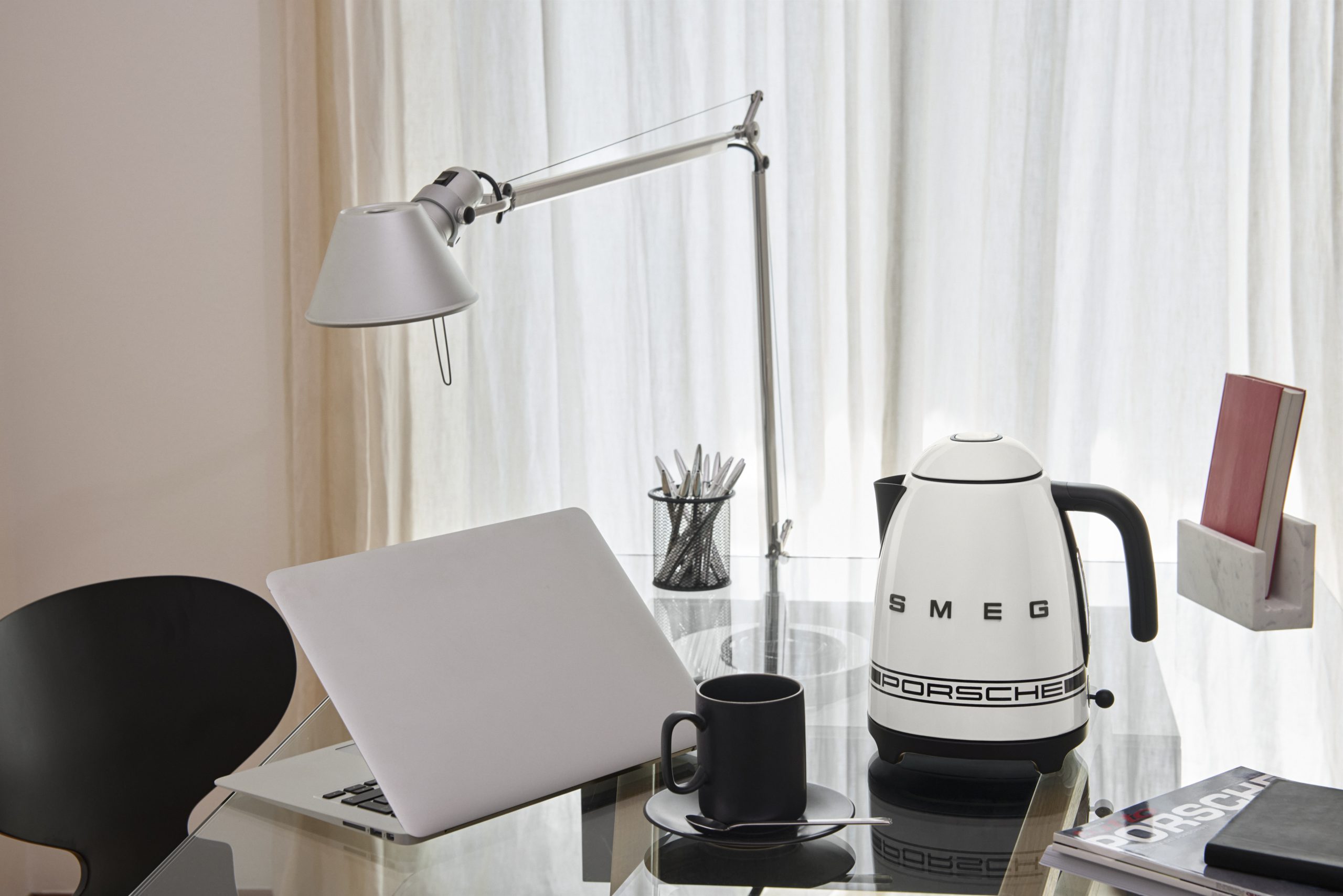 Wasserkocher – Porsche x Smeg Der Wasserkocher – Porsche x Smeg vereint Funktionalität und Design. Er eignet sich ideal für die Zubereitung von Heißgetränken und kombiniert den Stil der 50er Jahre von Smeg mit dem ikonischen Design von Porsche. Er verfügt über den charakteristischen Porsche Streifen auf dem Gehäuse in carraraweißmetallic und shadegreenmetallic sowie mattschwarze Akzente an Griff, Sockel und Ausguss. Individuelle Nummerierungen auf dem Temperaturmesser und von Porsche inspirierte Symbole sorgen für eine unverwechselbare Note. Mit einem Fassungsvermögen von 1,7 l – genug für sieben Tassen – eignet er sich sowohl für Momente allein als auch für gesellige Runden. Der „Soft Opening“-Deckel sorgt für eine reibungslose Bedienung, und der herausnehmbare Kalkfilter aus Edelstahl hält das Wasser sauber. Der 360-Grad-drehbare Sockel ermöglicht eine flexible Positionierung, und der Wasserkocher schaltet sich aus Sicherheitsgründen bei 100 °C automatisch ab.