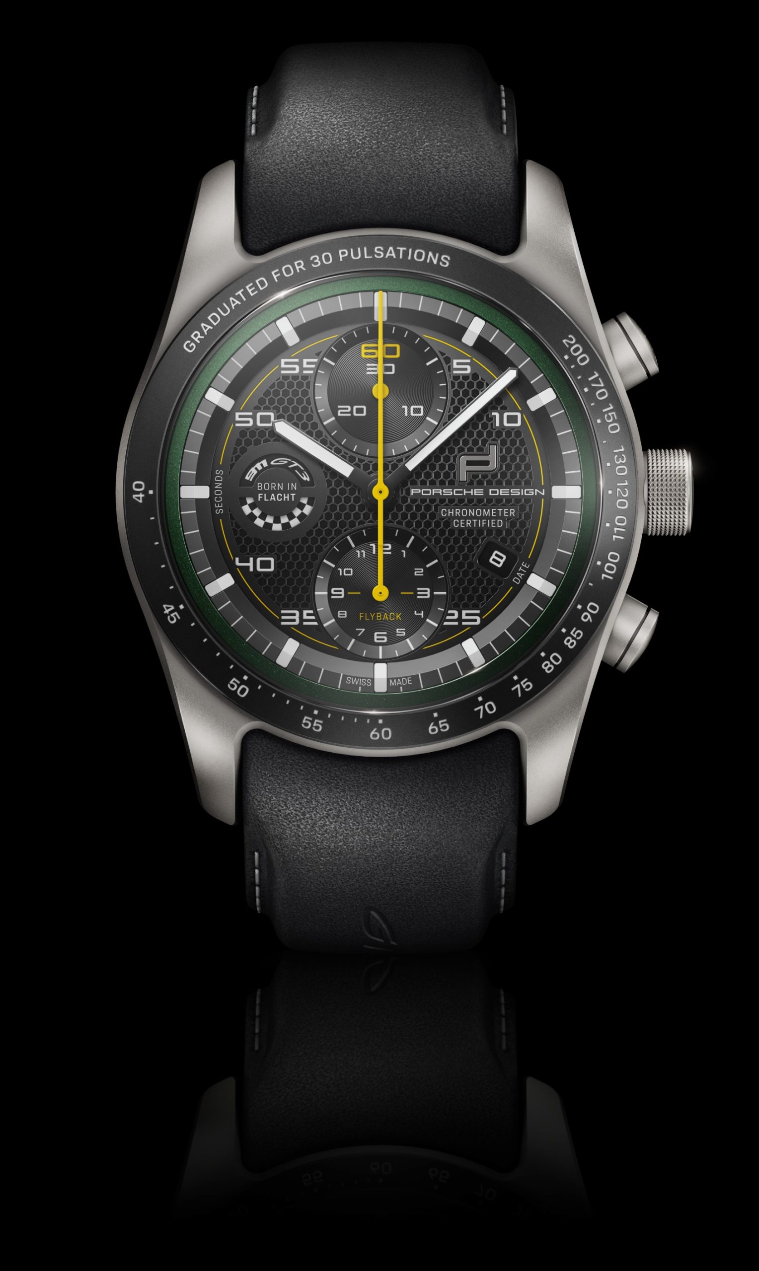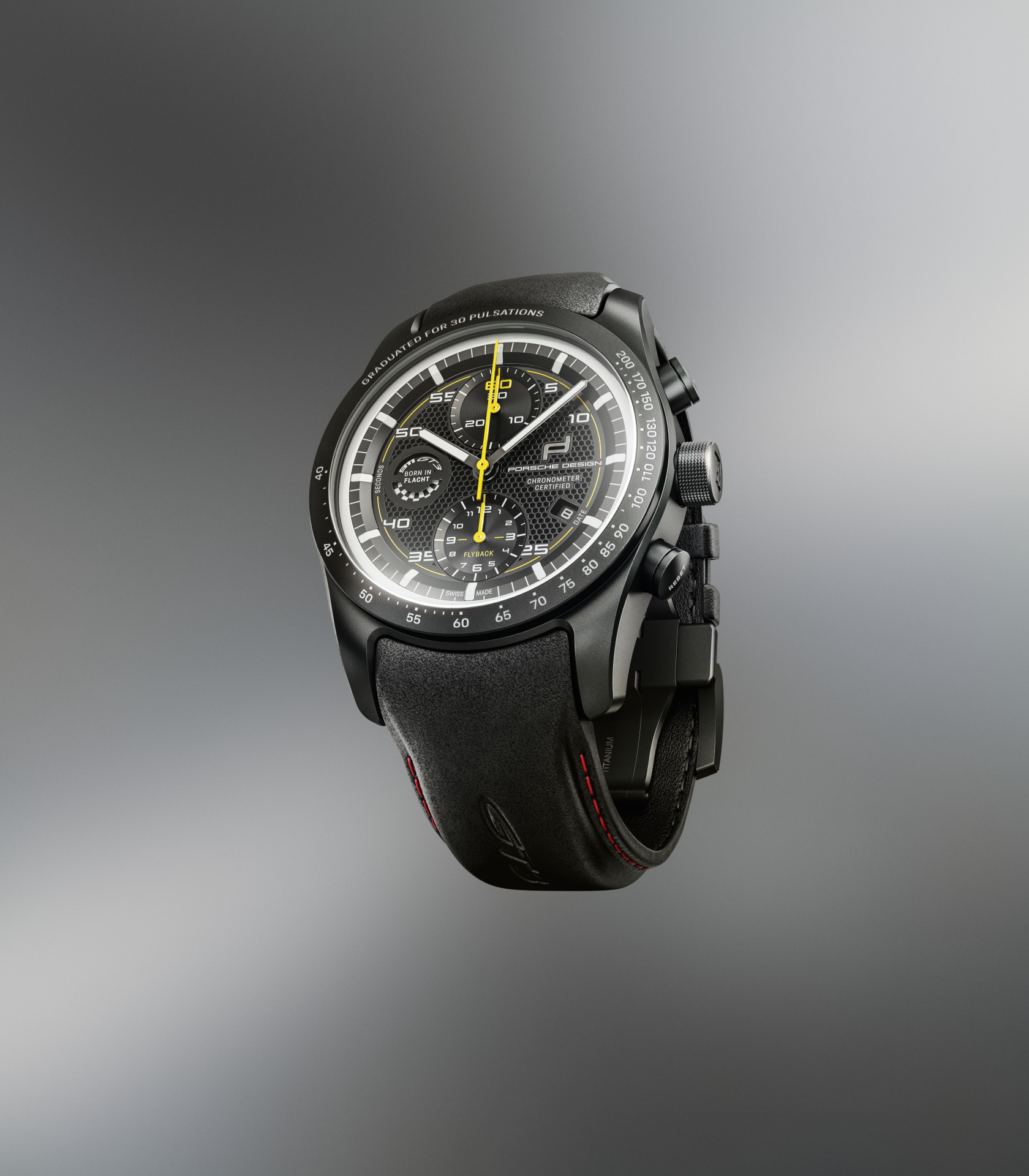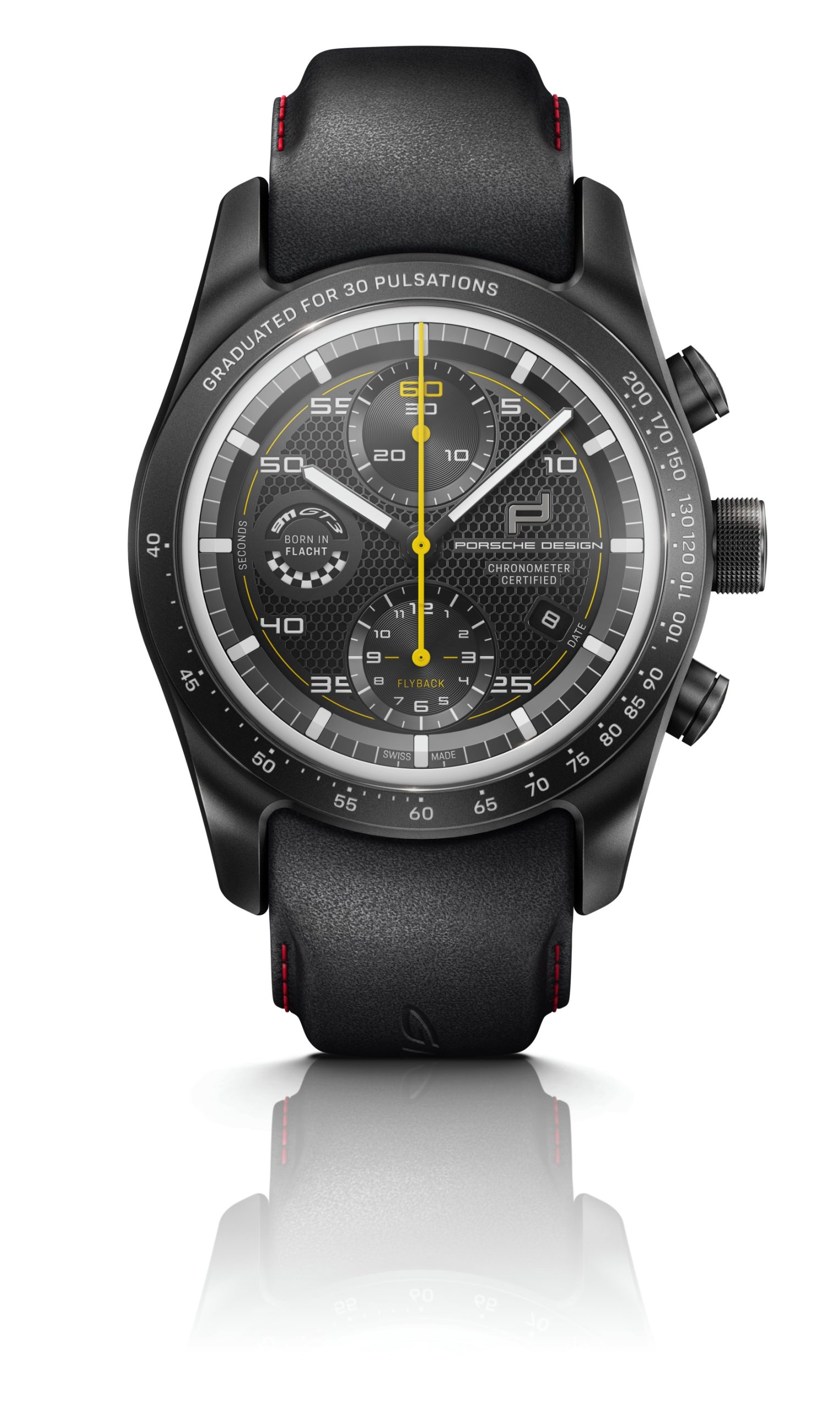 Das Gehäuse des „Sportwagens am Handgelenk“ besteht aus ultraleichtem Titan und ist in einer glasperlgestrahlten Ausführung erhältlich oder optional mit einer matt-schwarzen Titancarbidbeschichtung versehen. Die Funktionalität des Zeitmessers steht der Präzision eines Sportwagens in nichts nach: Das Porsche Design Kaliber WERK 01.200 mit COSC-Zertifizierung verfügt über eine Flyback-Funktion, mit der eine laufende Zeitmessung mit einem Knopfdruck gestoppt, zurückgesetzt und neu gestartet werden kann. Die Lünette kann wahlweise mit einer Pulsometer-, Tachymeter- oder einer Minutenskala ausgestattet werden. Die Pulsometervariante ermöglicht es, den Puls mechanisch zu messen – ohne Batterie und störende Magnetfelder.