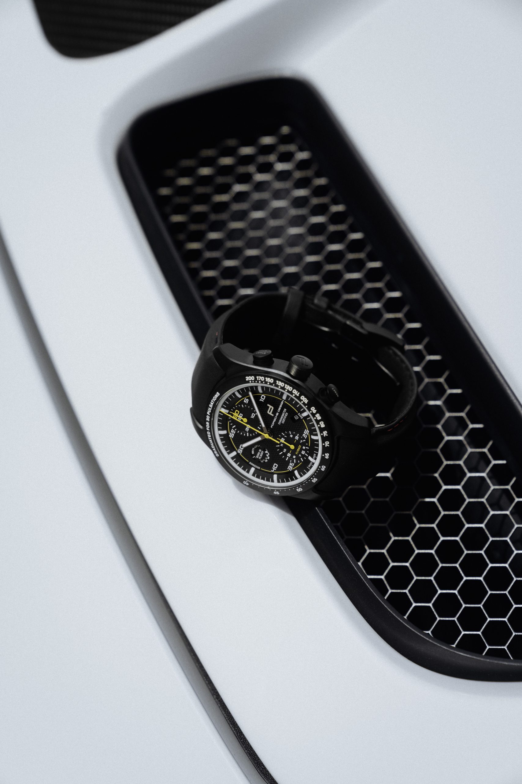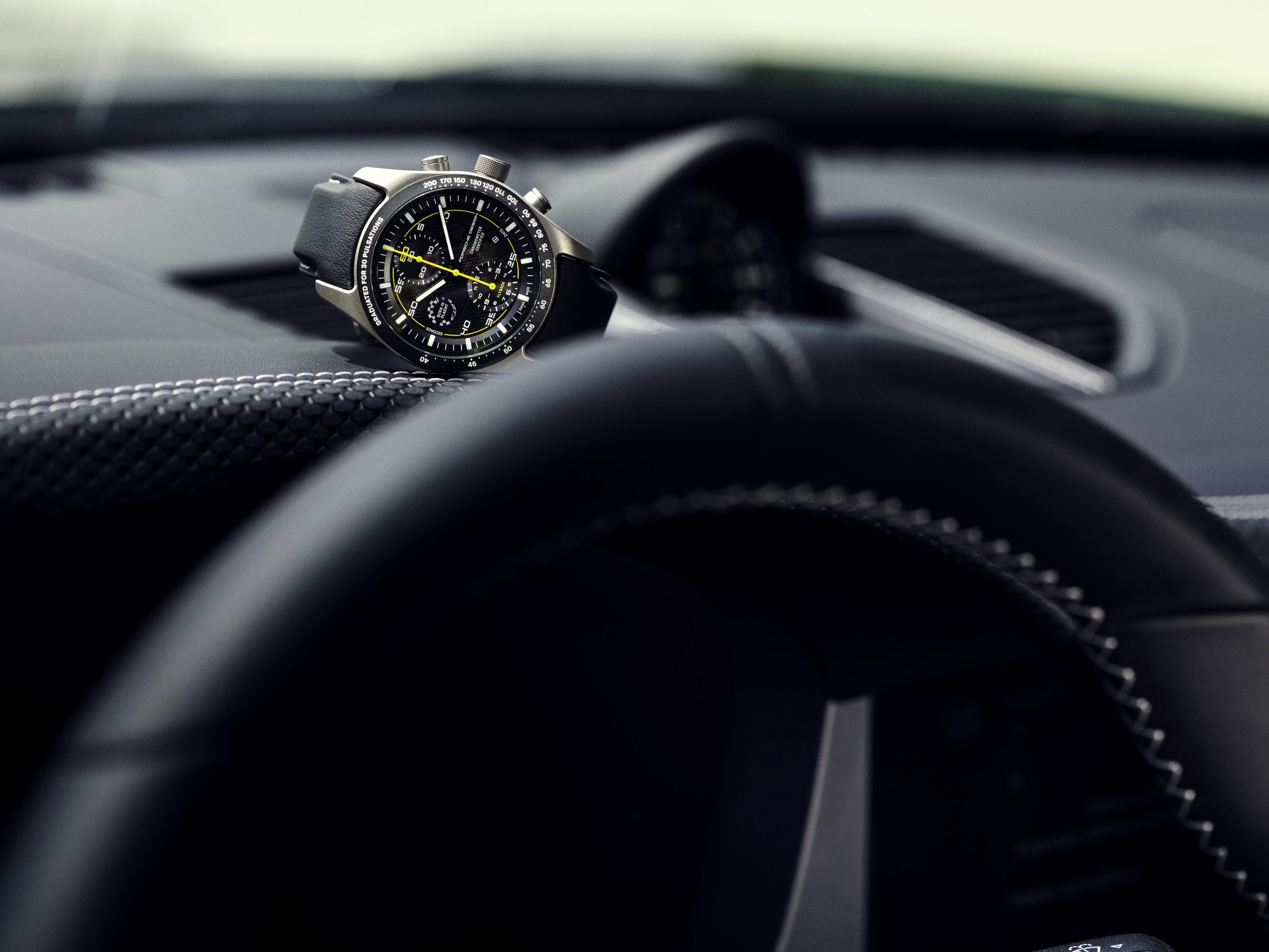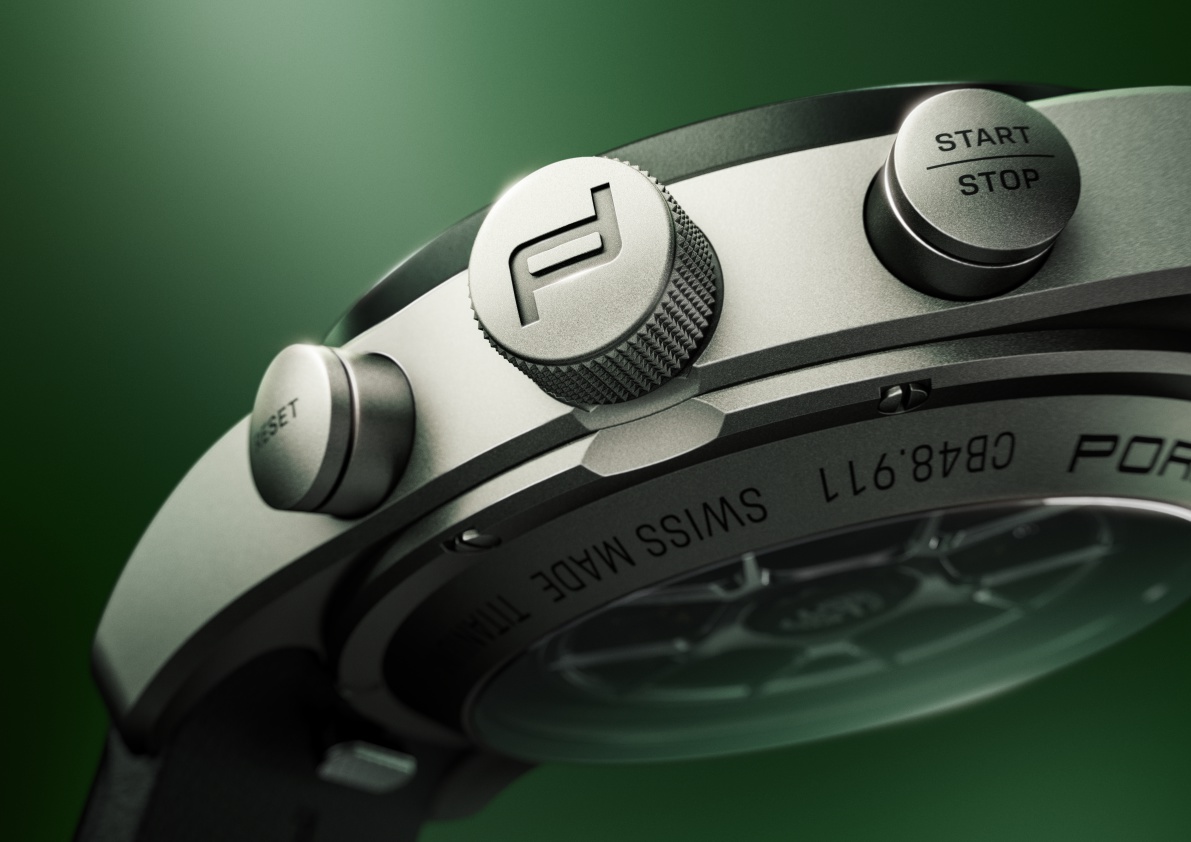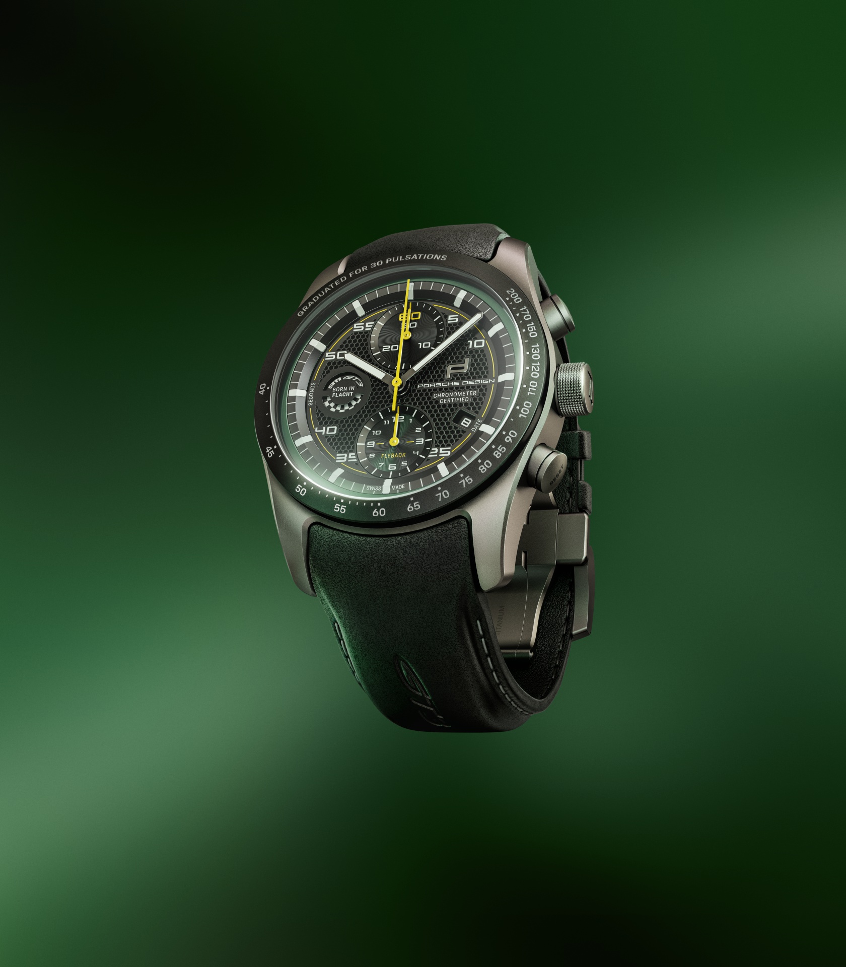Das Gehäuse des „Sportwagens am Handgelenk“ besteht aus ultraleichtem Titan und ist in einer glasperlgestrahlten Ausführung erhältlich oder optional mit einer matt-schwarzen Titancarbidbeschichtung versehen. Die Funktionalität des Zeitmessers steht der Präzision eines Sportwagens in nichts nach: Das Porsche Design Kaliber WERK 01.200 mit COSC-Zertifizierung verfügt über eine Flyback-Funktion, mit der eine laufende Zeitmessung mit einem Knopfdruck gestoppt, zurückgesetzt und neu gestartet werden kann. Die Lünette kann wahlweise mit einer Pulsometer-, Tachymeter- oder einer Minutenskala ausgestattet werden. Die Pulsometervariante ermöglicht es, den Puls mechanisch zu messen – ohne Batterie und störende Magnetfelder.