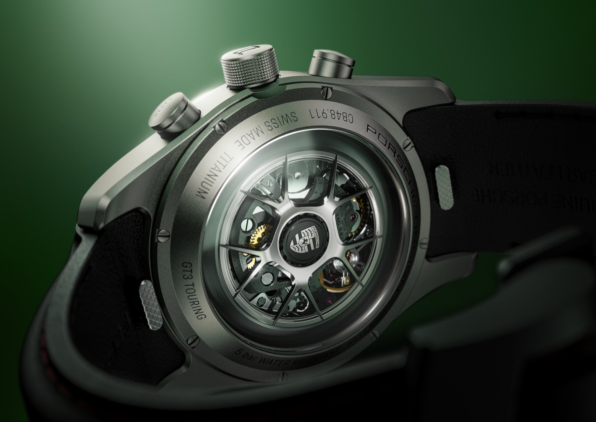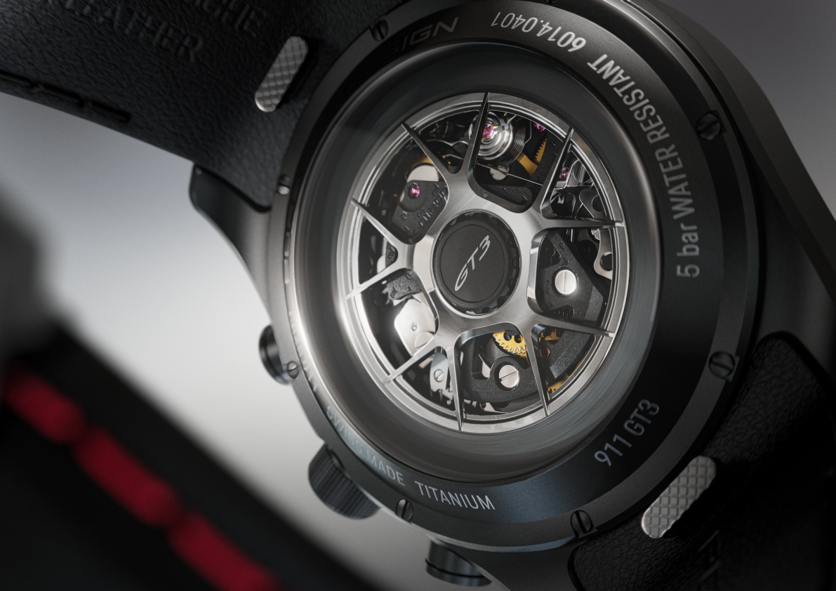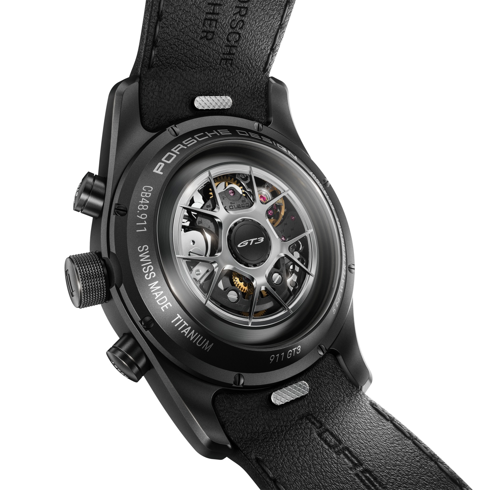Der Gehäuseboden besteht ebenfalls aus Saphirglas, welches siebenfach entspiegelt und hartbeschichtet ist. Der Chronograph wird von einem Aufzugsrotor angetrieben, der dem Design der jeweiligen Fahrzeugfelge des 911 GT3 und 911 GT3 mit Touring Paket bis ins Detail nachempfunden und in den entsprechenden Farben erhältlich ist, darunter Californiagold, Brilliantsilver, Darksilver und Schwarz (seidenglanz). Besitzer des 911 GT3 mit Weissach- oder 911 GT3 Touring mit Leichtbau-Paket können zudem den exklusiven „911 GT3 Weissach Rotor“ wählen. Die schwarze Rotorkappe ziert ein „GT3“-Schriftzug in Brillantsilber oder das zweifarbige Porsche Wappen.