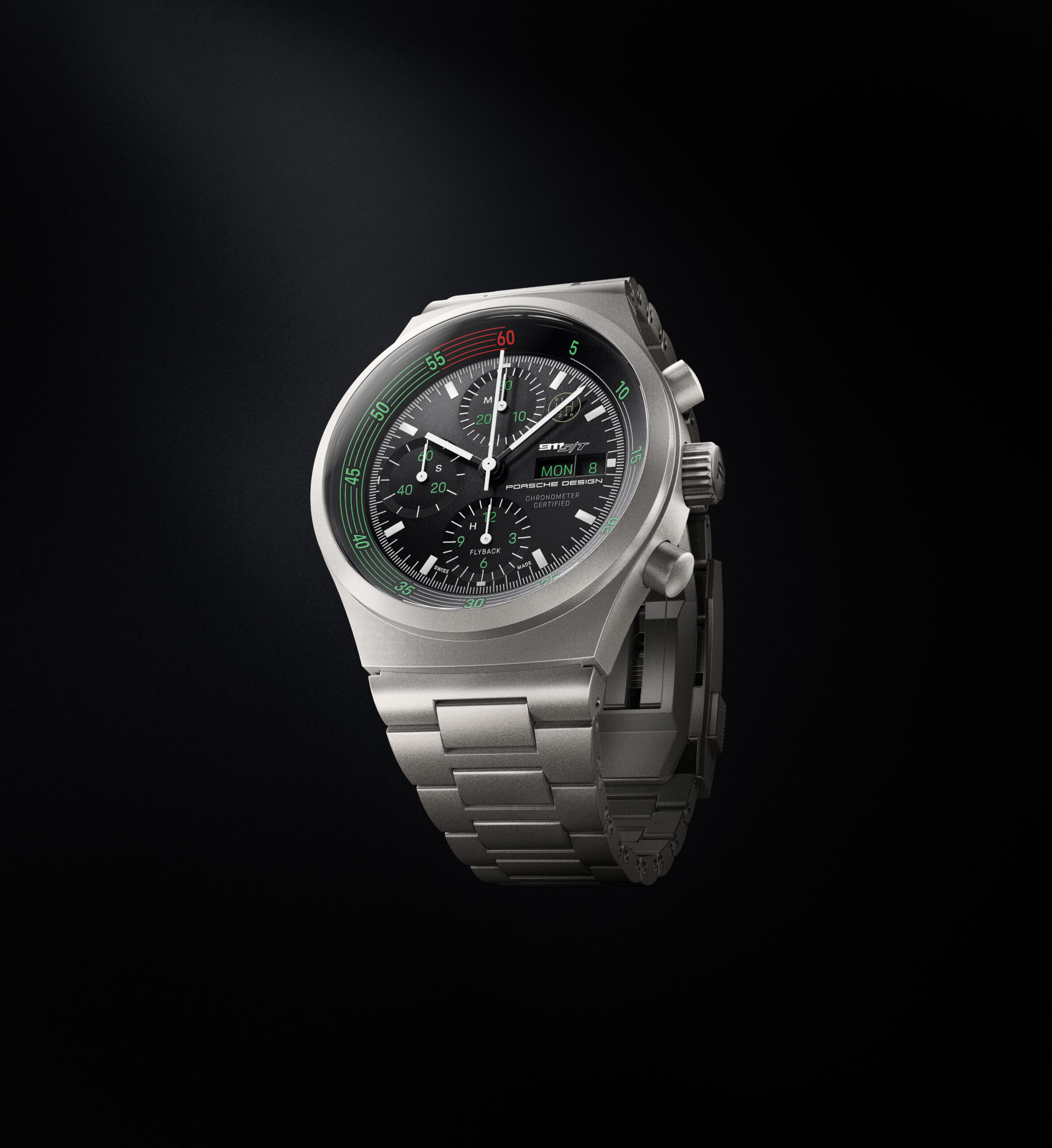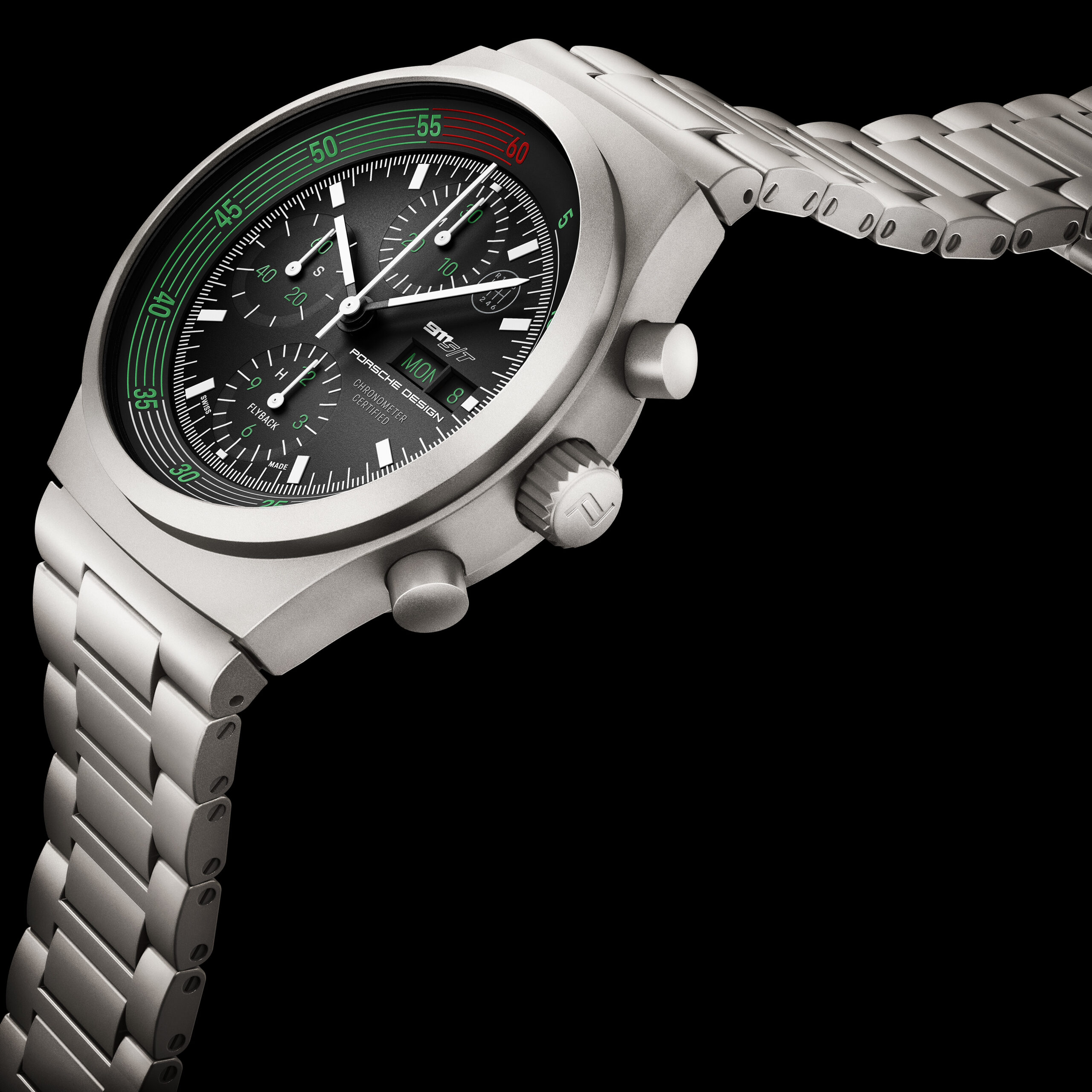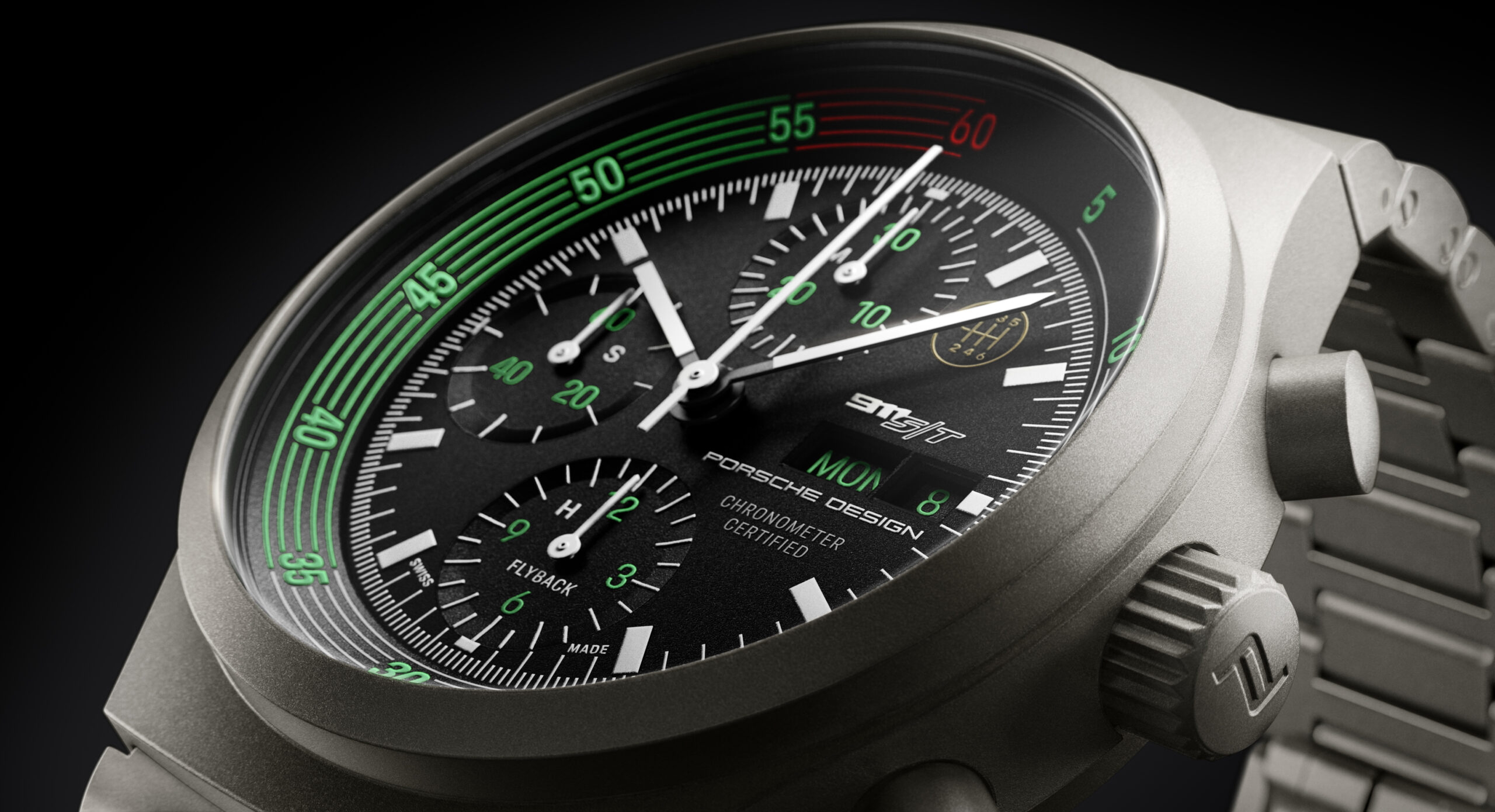 Das Gehäuse des Chronographen, gefertigt aus leichtem Titan und aus Gewichtsgründen unbeschichtet und gestrahlt, greift das Leichtbaukonzept des Porsche 911 S/T auf. Das Ziffernblatt und der Rehaut des Zeitmessers in Schwarz spiegeln die historischen Anzeigeninstrumente des 911 S/T wider. Dabei ist die Minuterieskala im Heritage-Drehzahlmesser-Look gehalten und die Zahl „60“ rot hervorgehoben, um das Jubiläum zu markieren. Die Zahlen, der Tag (zweisprachig, Deutsch und Englisch) und das Datum sind in leuchtendem Phosphorgrün gehalten, während der weiße Stoppsekundenzeiger die Farbe des Drehzahlmessers aufgreift. Der Minuten- und der Stundenzeiger sorgen dank Leuchtmasse aus Super-LumiNova® auch bei Dunkelheit für eine präzise Ablesbarkeit. Ein aufgedrucktes Schaltschema in Silber für den Chronograph 1 – 911 S/T und in Gold für den Chronograph 1 – 911 S/T Heritage unterstreicht die enge Verbindung zum handgeschalteten Sondermodell. Ebenfalls direkt vom Schaltschema abgeleitet, ist die Schriftart der Buchstaben H, M und S für Stunden, Minuten und Sekunden in den Totalisatoren.